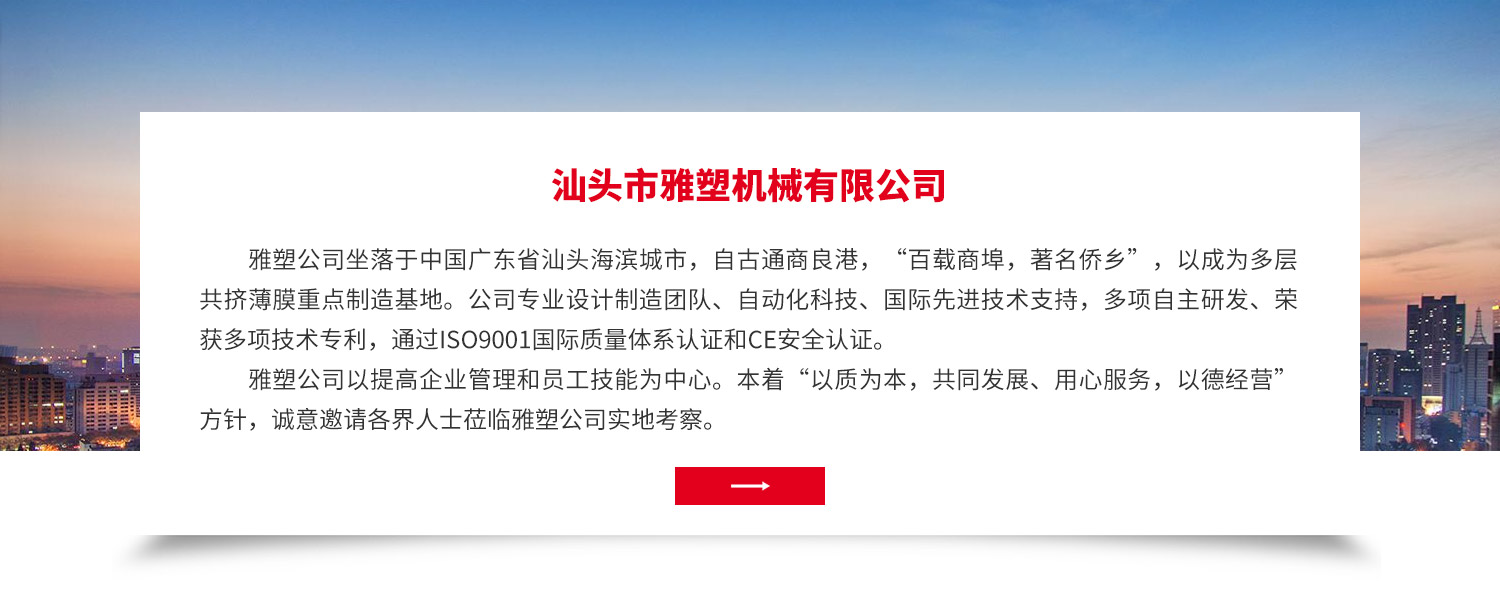 •   雅塑公司坐落于中國廣東省汕頭海濱城市,自古通商良港,“百載商埠,著名僑鄉(xiāng)”,以成為多層共擠薄膜重點制造基地。